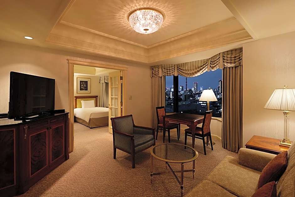 Room featuring views of Okuma Garden through a bay window, vaulted ceilings and a classic Italian decor. French doors connect the bedroom to the living room, which features a sofa, a TV and a mini-bar. Bathrooms offer a marble countertop with double sinks, a bath tub and complimentary toiletries. Free Wi-Fi is provided.